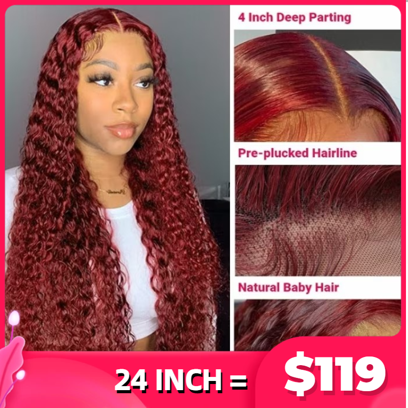 [$119 | 24''] 180% 99J Colored Curly Hair Pre Plucked T Part Wig Burgundy Middle Part Lace Wigs