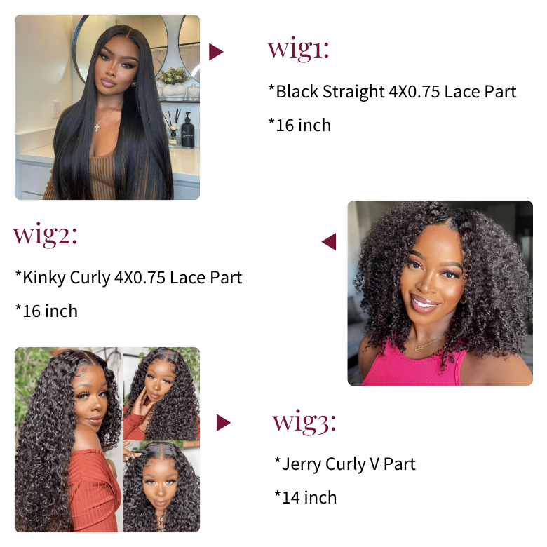 $199=3 Wigs| 16 inch Silky Straight Lace Part Wig And 16 inch Kinky Curly Lace Part Wig And 14 Inch Jerry Curly V Part Wig Member Exclusive