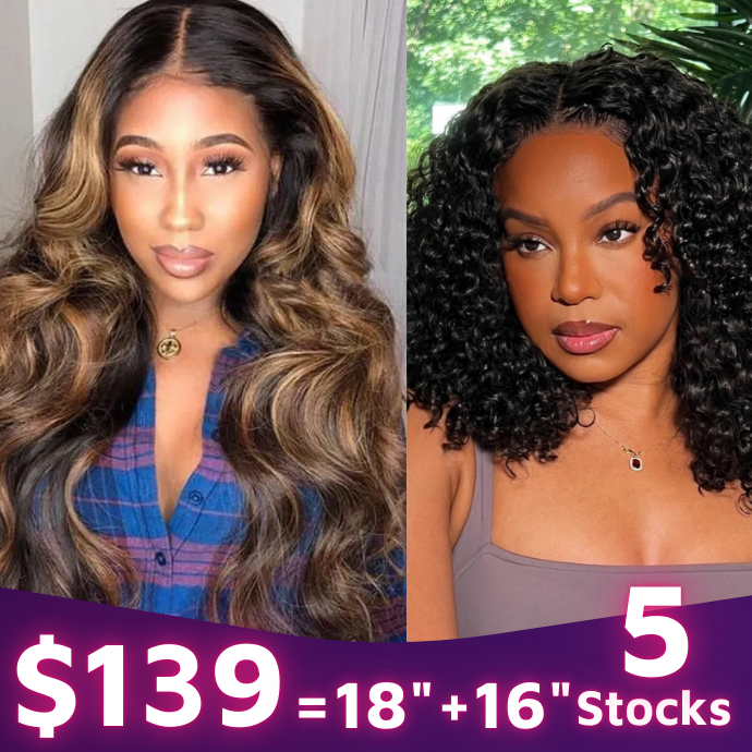 2 Wigs=$139|Lace Part Body Wave Balayage Brown Highlights And Lace Part Natural Color Kinky Curly Wig