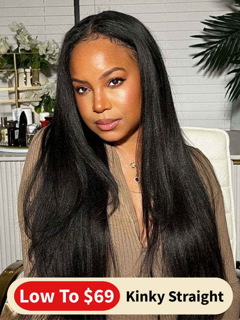 Low To $69 | Natural Black Kinky Straight 4x0.75 Lace Part Wig And V Part Wig