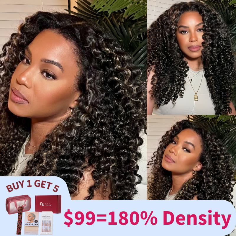 $99=18inch|180% Density 7x5 Bye Bye Knots Blonde Highlight Balayage Black Kinky Curly Wig
