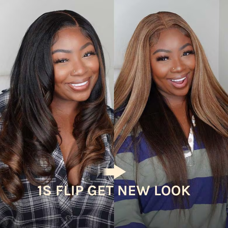 $79=18" | Double Wear 4x4 Yaki Straight Wig Ombre Chestnut Brown & Honey Blonde Higlight 2 Styles In 1 Put On And Go Wig Member Exclusive