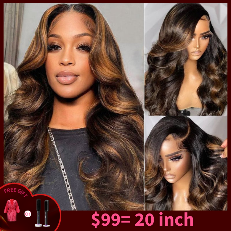 $99=20 inch| Balayage Brown Highlight 3D Body Wave 13X4 And 7X5 Bye Bye Knots Glueless Wig Black Friday Exclusive
