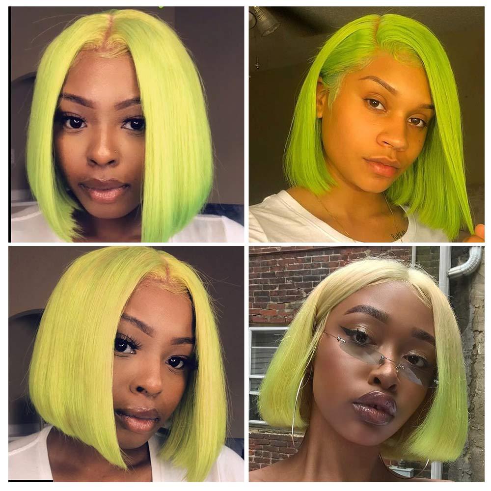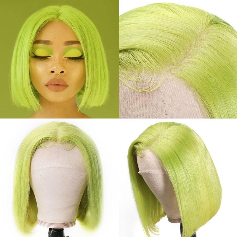 13x4 Lace Front Neon Green Bob Wig 150% Density Straight Human Hair Pre Plucked Wigs