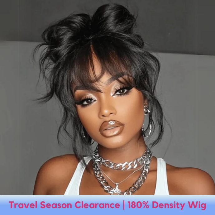 Travel Season Clearance | 7x5 Bye Bye Knots 180% Density Fluffy Loose Wave Wig With Curtain Bangs Put on and Go Human Hair Wig