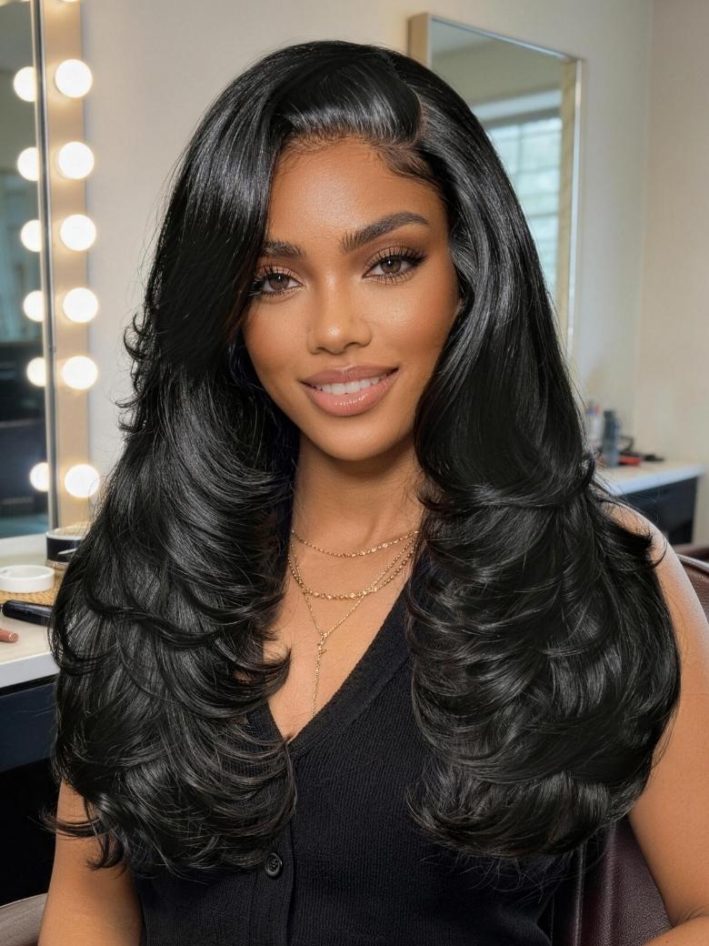 Beautyforever 7x5 Glueless Lace No Slip™ Wig Face-framing Feathered Layers Loose Wave Human Hair with 90s Swoop Bangs