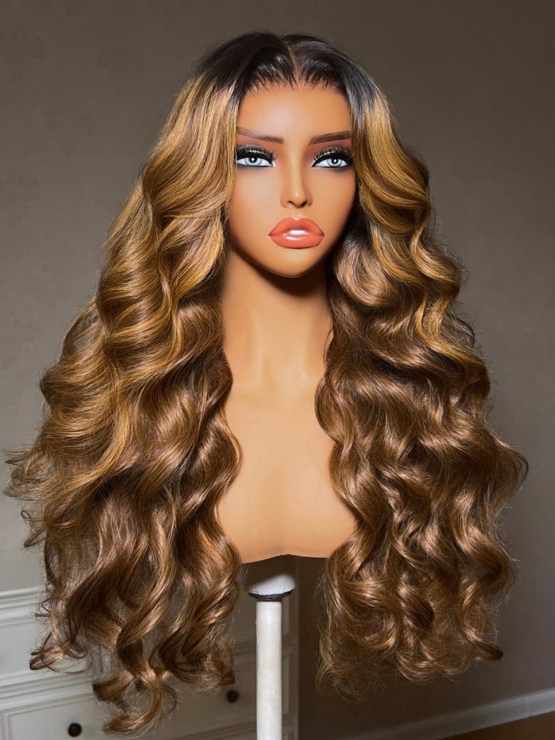 Beautyforever 7x5 Bye Bye Knots Glulelss Lace Wig Golden Honey Brown Piano Highlight Body Wave Wig with Dark Roots