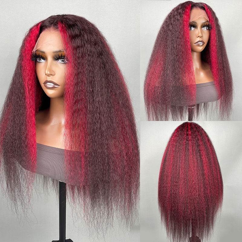 Beautyforever Dark Burgundy Highlights with Crimson Red Stripes Kinky Straight 13x4 Lace Front Wig