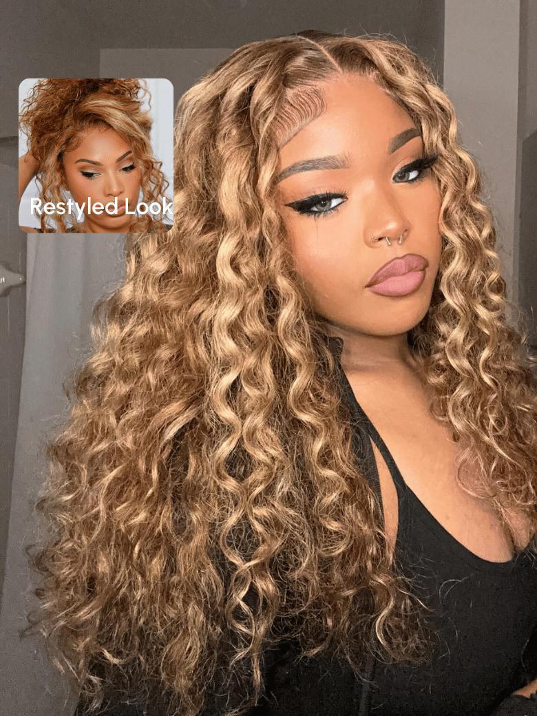 Low to $89| 7X5 Byebye Knots Water Wave Honey Blonde Highlight Glueless Pre Cut Lace Wig