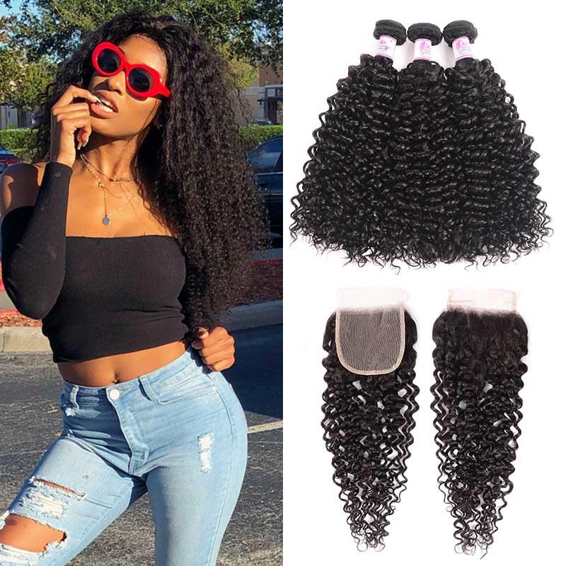 Beautyforever Jerry Curly Human Hair 4x4 HD Lace Closure With 3Bundles Indian Hair On Sale