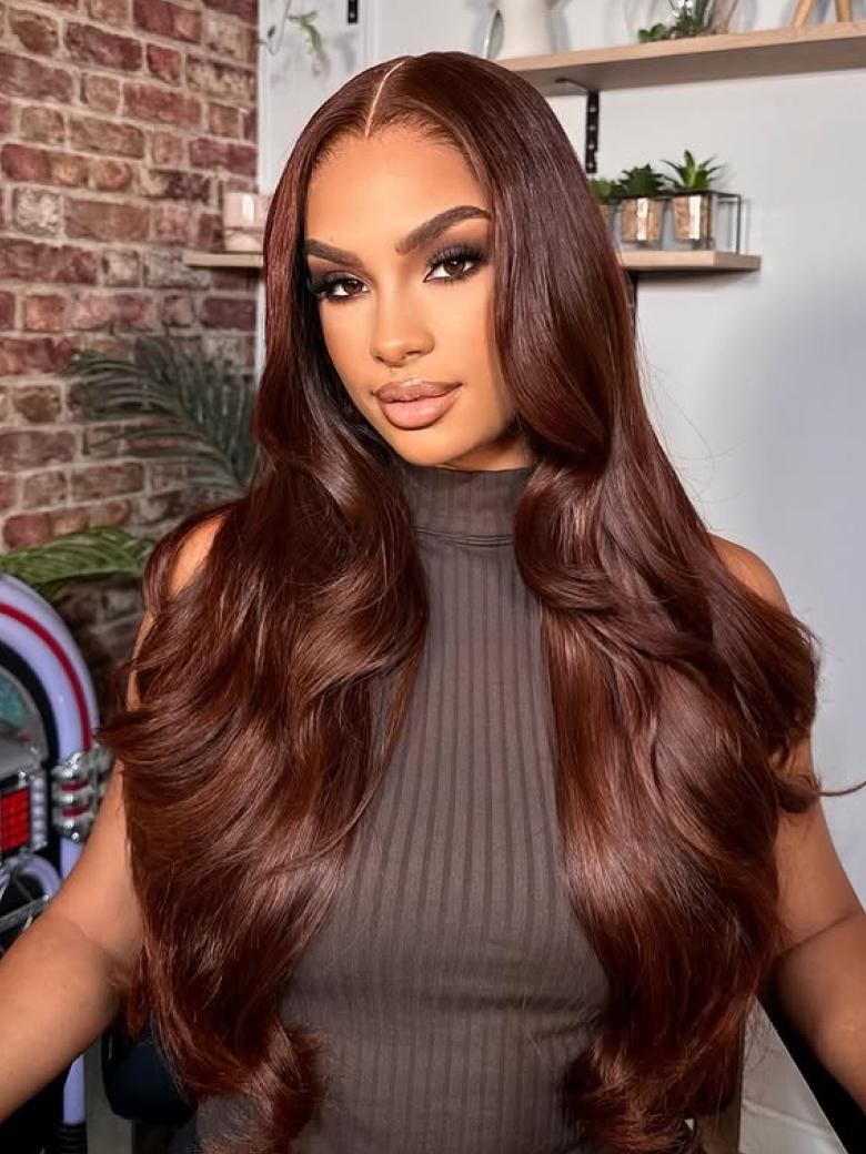 Beautyforever 13x4 Pre-Everything Lace Frontal Reddish Brown Dark Auburn Loose Wave Human Hair Wigs with Curtain Bangs