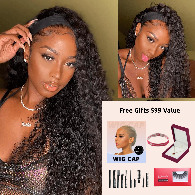 Beautyforever TikTok Headband Wig Water Wave Glueless Human Hair Wigs With Pre-attached Scarf Natural Color 200% Density