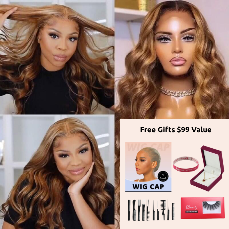 Beautyforever TikTok Highlight Blonde Body Wave 13x4 Lace Front Human Hair Wigs For Women Brown Piano Color Lace Wigs
