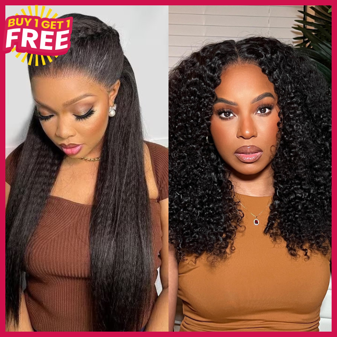 [Bogo]18" 180% Density V Part Natural Color Jerry Curly And 18" Lace Part Kinky Straight Natural Color