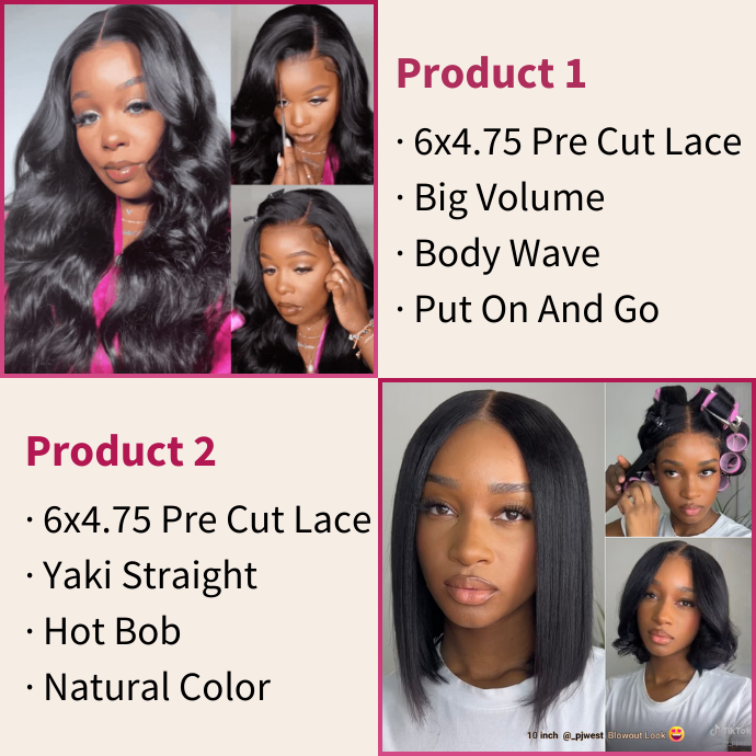 A. 16" 6x4.75 Pre Cut Lace Natural Color Body Wave And 10" 6x4.75 Pre Cut Lace Natural Color Yaki Straight Bob