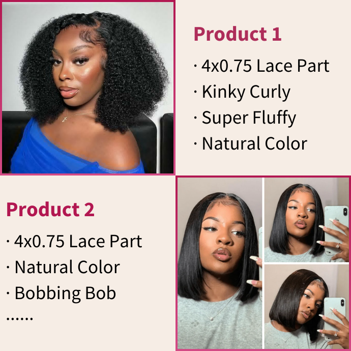 [Bogo]Kinky Curly Natural Color Lace Part And 4x0.75 Natural Color Straight Bob Wig