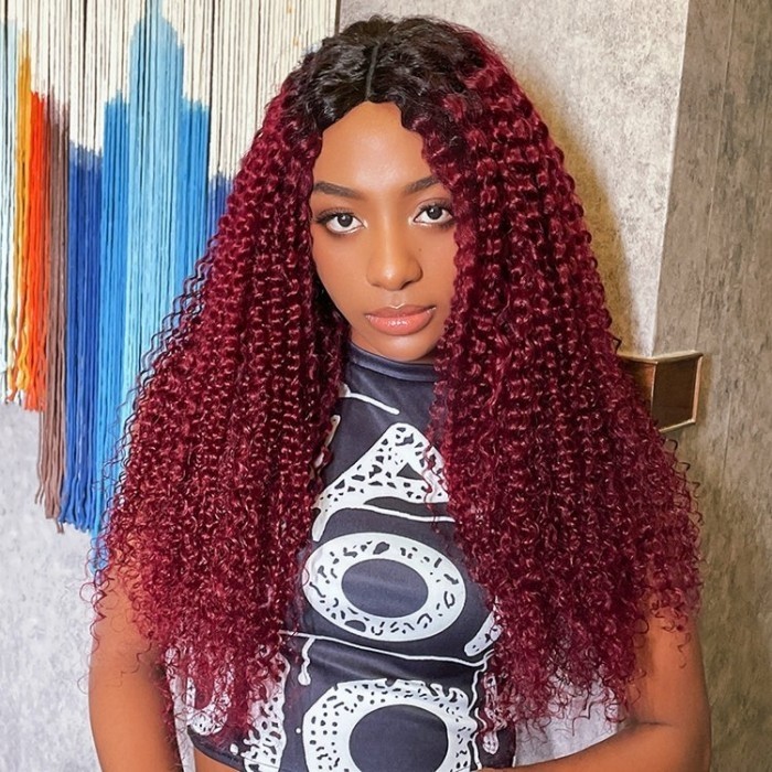 Buy 1 Get 1 Free| No Glue Needed Ombre Burgundy Jerry Curly V Part Wig