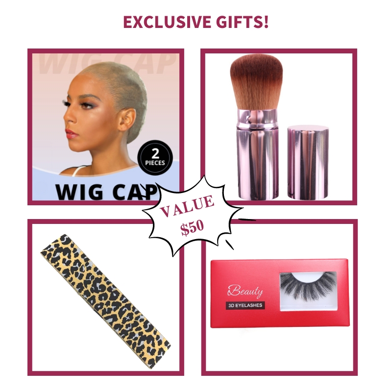 2 or 1 Free Gift for Wigs or Bundles: Stretch headband,Wig Cap,Customized Manicure